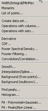 Polynomial+Gaussian: makes a fit of the current set with a function made by a polynomial, gaussian or a combination of them.