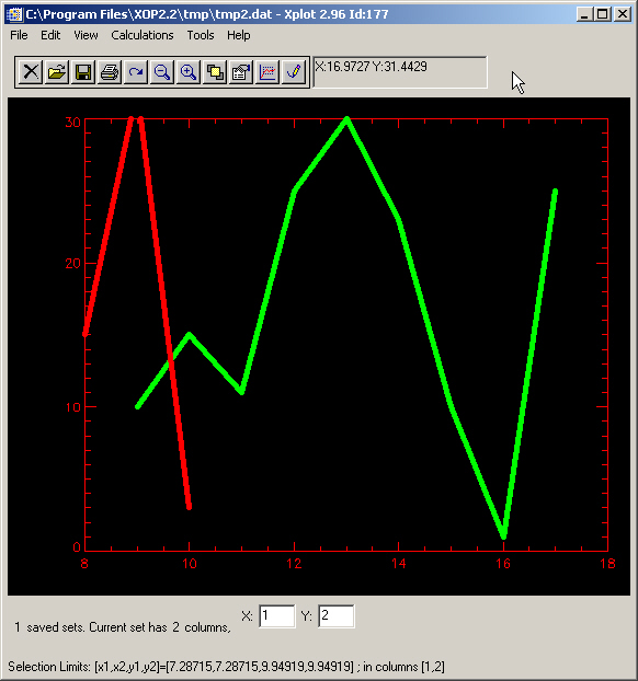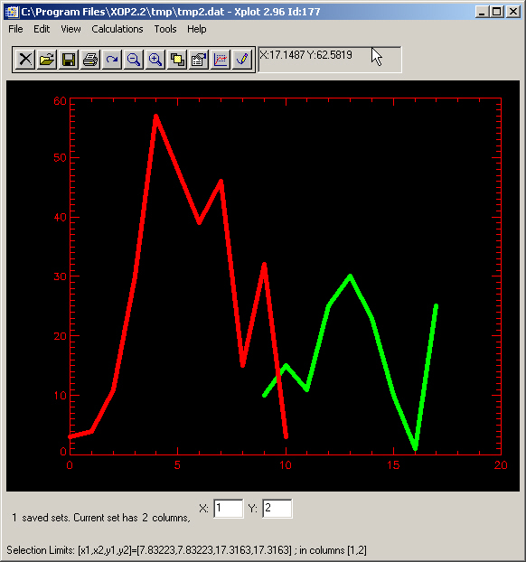 Selected data: Click and drag the mouse over the wanted region in the drawing area. You selected an X and Y interval in the plotted data. The selected limits appear in the Xplot message. We call ”r;selected data” the points of the current set with X values in that interval.