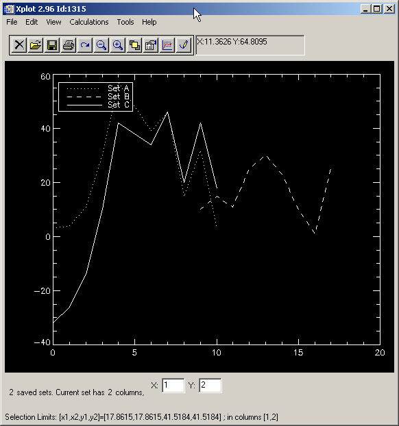 A set is an array or matrix containing N points (or rows) and M columns. Our file tmp.dat contains a single set, with two columns. A SPEC file usually contains many sets (or scans). When a set is loaded in Xplot (usually by Xplot>File>Load data file you can manipulate it using the Xplot controls. It is called current set.
