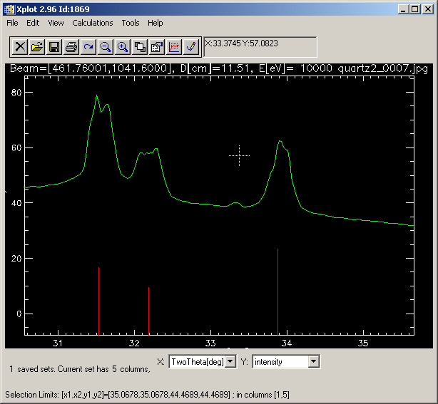 Now we want to overplot rings that correspond to the position of the peaks in the diffractogram of our reference (quartz). For that you should prepare a multicolumn file with at least two columns. In the first column place either the d-spacing or 2q values of the peak positions. In the second column place the peak intensity (arbitrary units).  In the third column you may place a color index, starting by 2. This allows you to overplot different phases each one with a different color.