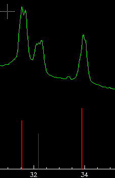 Next step is to use . Try it and accept all dialogs. In a first step, you will see an annular region around each ring. The program extracts the pixels within these annuli (the width of the annuli can be changed using the ROI/Mask Manager, annulus tab), make some binning (calculates the center of mass for a number of azimuthal sectors, which number is defined in "Edit>Preferences...", and applied a non-linear optimization algorithm to optimize the detector+beam parameters to the experimental data. The diffractogram calculated after accepting these new parameters still present some strange features in the peaks, which are probably due to non-orthogonality effects: