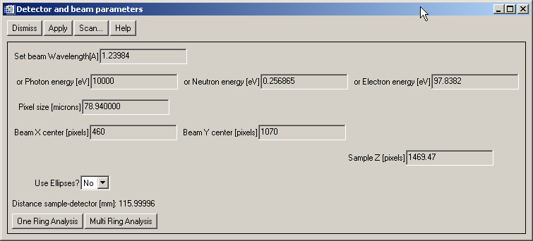 Select "Diffraction>Select detector and beam pars...". You will get a window in which you could define some of the parameters of your measurement. For example, we know that our image is an x-ray diffraction image measured with a camera with a pixel dimension of 78.94 mm, the photon beam had an energy of 10000 eV and the distance detector-sample is about 11.6 cm. We fill these values, select "Use ellipses=No" (this means that we suppose that the beam is orthogonal to the detector, we may later correct for small non-orthogonality, but it is a good idea to start like that). Nothe that the detector distance must be entered in pixels so we put 116/0.07894=1467.97. Also, we placed rough values of the beam center (center of the rings) that we may obtain pointing to the center and copying the cursor values. We get: