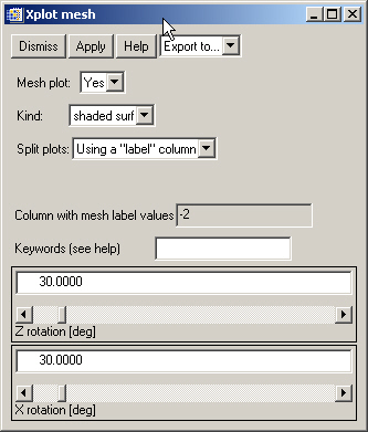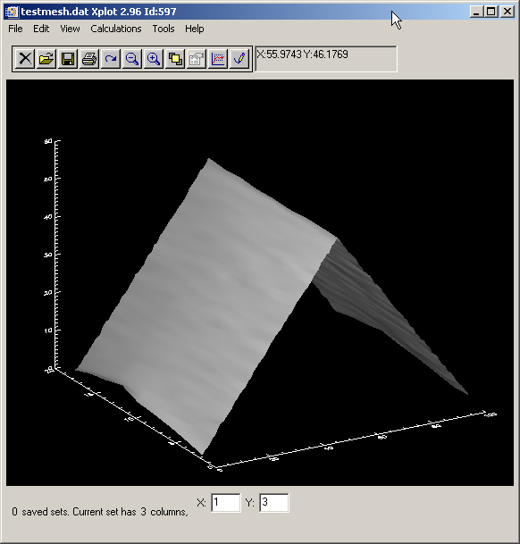 Although Xplot has been designed to plot XY graphs, it can also display some graphs multiple data sets. A multiple data set is defined as a single data set with different plots one after the other. All individual plots must have the same number of points. The position where a plot ends and the next plot starts can be defined by the line position (or the number of points of the individual plots) of by an additional label column. The label column has a different value for each individual plot. Three kind of MESH view are possible: lines, surface and contour.