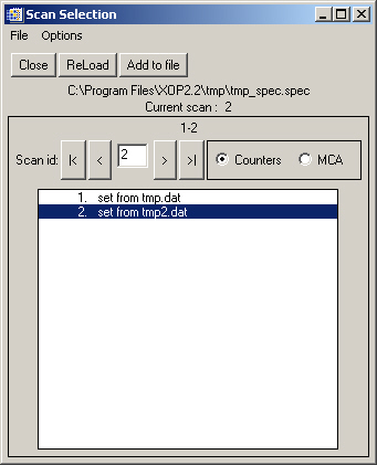 In order to store a SPEC data file in Xplot, use the File>Load data File... option and select a SPEC file. Once you have done that, the first scan in the file is displayed in the Xplot window, and the bottom part of the Xplot window changes a bit its aspect, allowing to change columns with a pull-down menu and to change scan number with the ”r;Sel Scan&ldots;” button.